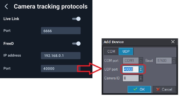 Geben Sie im Feld UDP port die Portnummer ein, die unter FreeD auf dem Bildschirm Camera tracking protocols auf dem Mars Dashboard angezeigt wird.