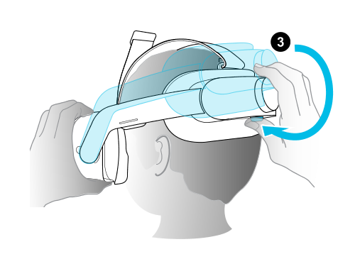 Setzen Sie das Headset über Ihre Augen. Halten Sie die Schnelleinstellungstaste gedrückt und schieben Sie den Kopfhörerbügel, bis er eng am Hinterkopf anliegt.