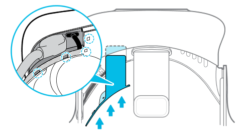 Setzen Sie das Gesichtspolster wieder ein, indem Sie die Lasche in den Schlitz des Headsets einführen und dann die Klettbänder ausrichten.