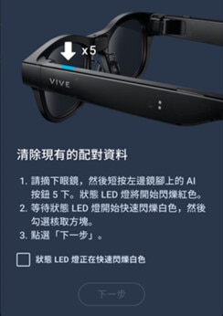 提示: 快速連續的短按 AI 按鈕 5下。 - 將眼鏡與新手機配對後,請依照螢幕上的指示完成眼鏡的設定。