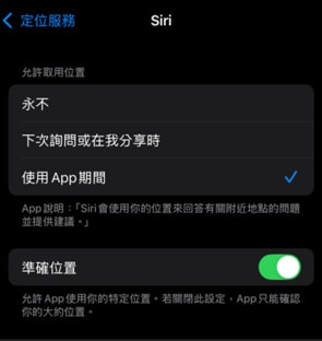 4. 然後確認已選取 使用 App 期間,並已開啟 準確位置