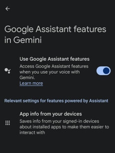 - モバイル版のGeminiアプリで、アカウントのアバターをタップしてから、設定 > GeminiのGoogle アシスタント機能に移動します。Google アシスタント機能を使用する をオフにしてから、再度オンにします。