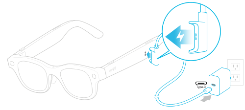 Charge the glasses by connecting the USB-C end of the charging cable to any USB charger with an output of at least 4.5 watts. Then connect the other end of the cable to the charging connector on the left temple of the glasses.