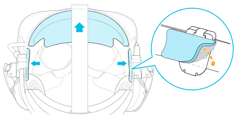 將前部襯墊和側面貼片裝回至頭戴式顯示器固定帶。確定側面貼片遮住固定帶上的金屬扣。