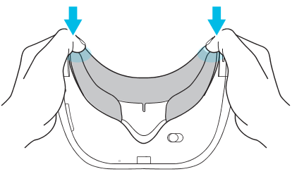 Hold the headset, similar to the illustration below, and then press down on the marked areas on the face cushion until you hear a soft click.